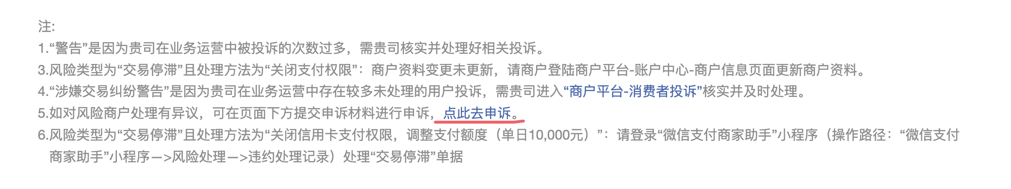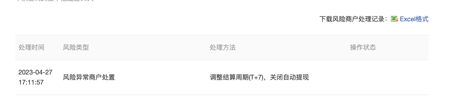 今天17点多的时候,我正在开车回家,突然收到一条消息,吓了我一跳,赶紧停车在路边,打开电脑端查看原因,只看到一句话:风险异常商户处置 调整结算周期(T+7),关闭自动提现。然后操作状态也没有申诉的按钮,我感到十分无助。