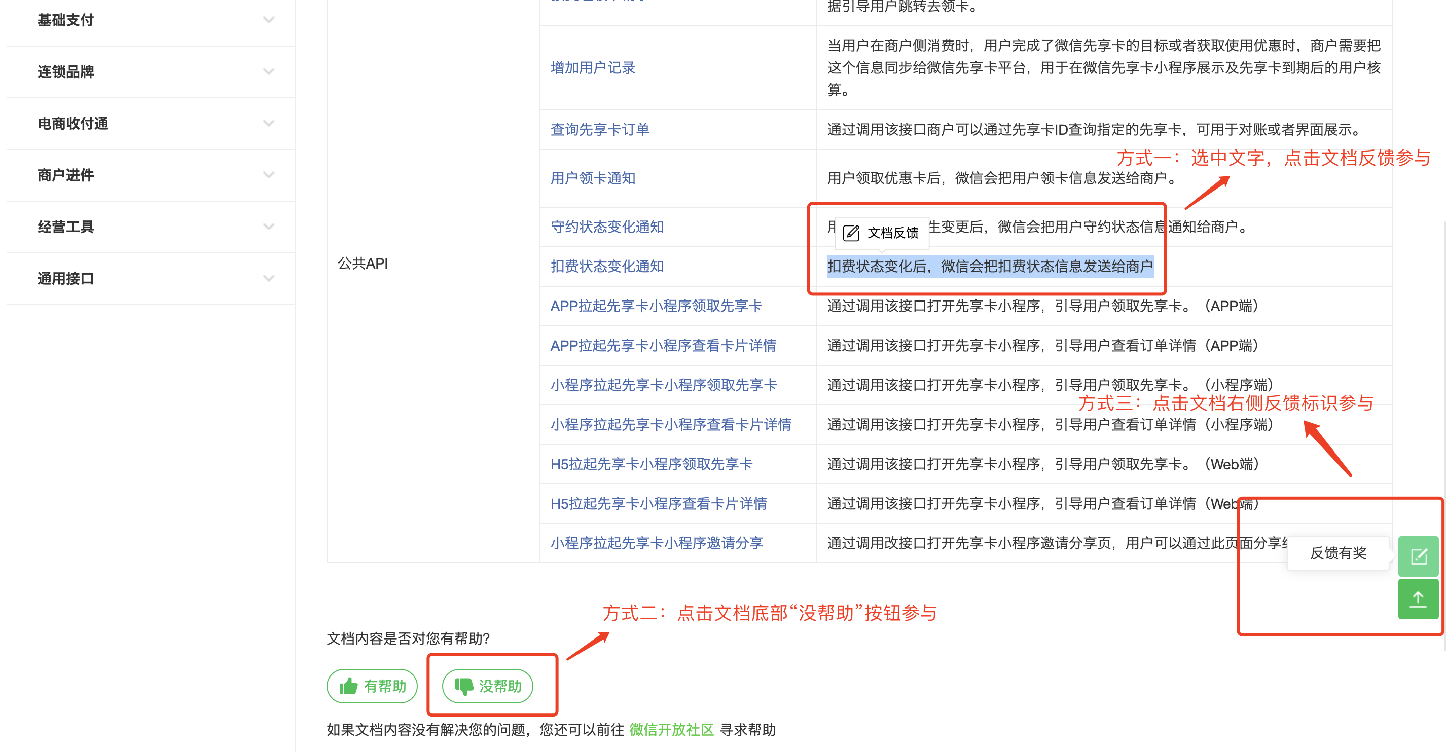 参与微信支付开放文档问题反馈活动的三种方式见下方截图: