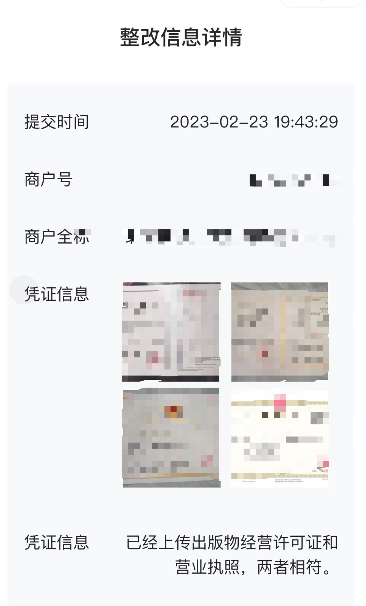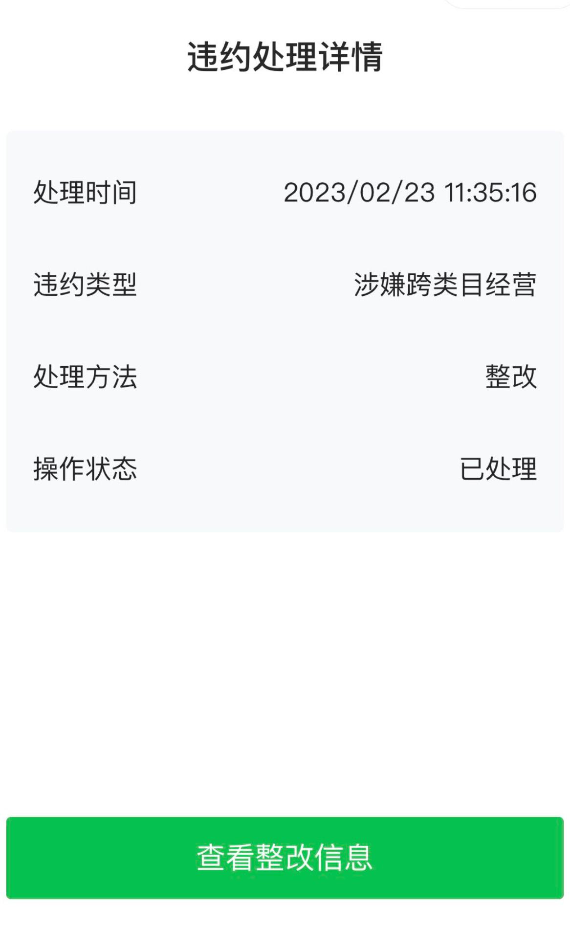 2.随后我们按照步骤进行了整改,整改信息内上传了我们的相关经营可证以及新的营业执照。目前状态是已处理。如下图