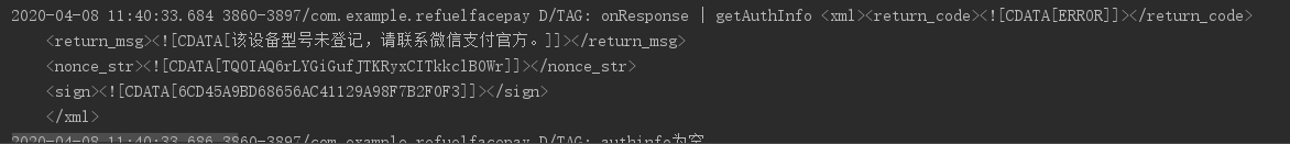 在平台上的商户APP使用是,获取调用凭证失败(authinfo为空)。查看返回xml.信息如下: