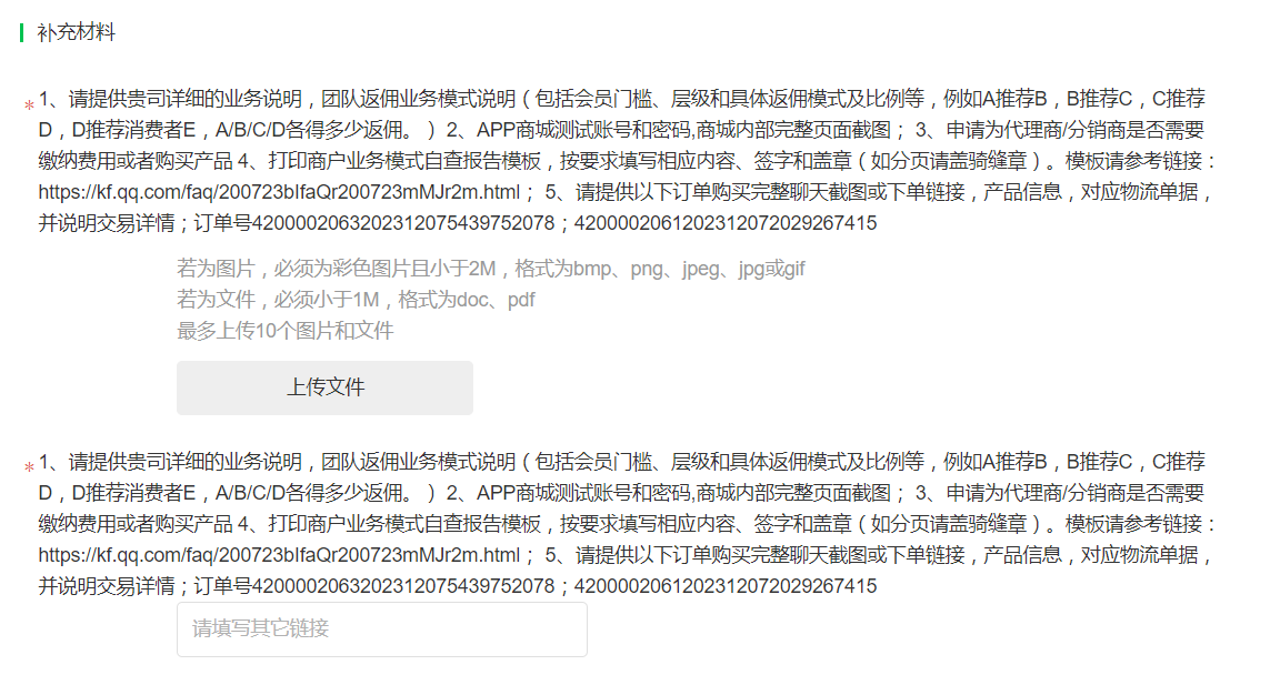 商城内部完整页面是要你提供订单、商品、会员、分销返佣等所有相关页面,不是聊天沟通下单的,提供商品链接、发货信息就可以,把所有内容放到腾讯文档链接,填入“其他链接”。