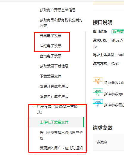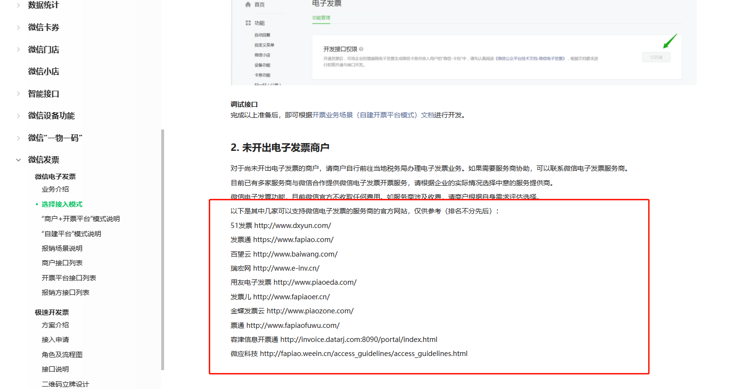 https://developers.weixin.qq.com/doc/offiaccount/WeChat_Invoice/E_Invoice/Vendor_API_List.htmlhttps://developers.weixin.qq.com/doc/offiaccount/WeChat_Invoice/E_Invoice/Vendor_API_List.html