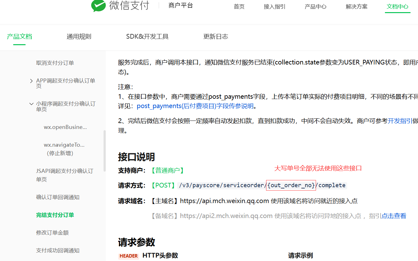 这里如果创建时用得单号存在大写字母,是可以创单成功的,但是在调用完结支付分接口、和取消支付分接口等会无法使用,一直提示查询单据不存在,强制转小写也无效,导致存在大写单号的微信支付单永远完结、取消不了,且不会系统自己释放,这样会导致用户微信支付分产品都不能正常使用。