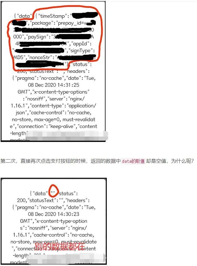 微信内置浏览器H5支付,第一次调用支付返回的data包含prepay_id等信息,当第一次支付取消,再二次点击支付调用支付的时候,发现第二次返回的data都为空,接着页面报错弹框【调用支付JSAPI缺少参数:total_fee】为什么?