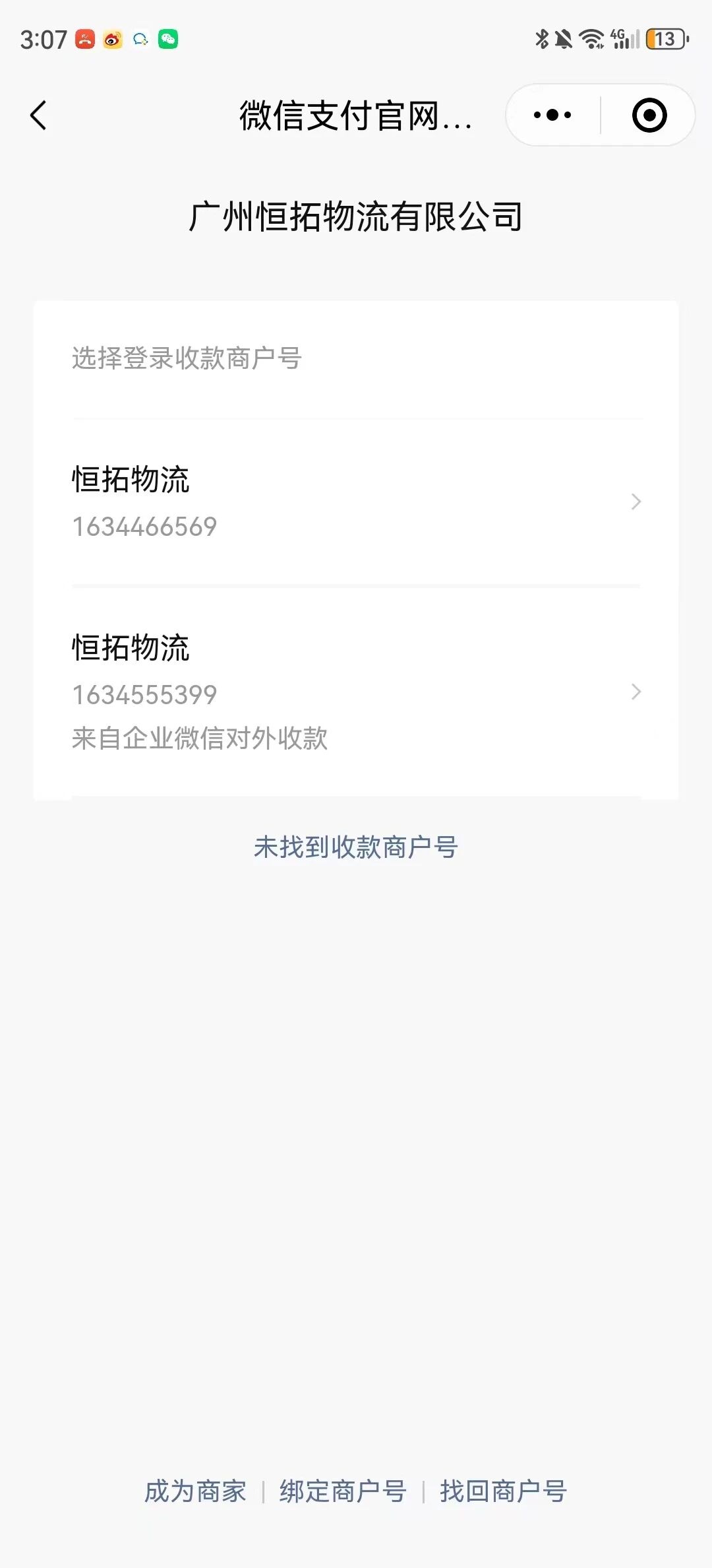本来应该还有一个商户号1633340888的,这边登录的时候查看没有这个选项,这边查了下信息是这个人登录的,请问什么情况