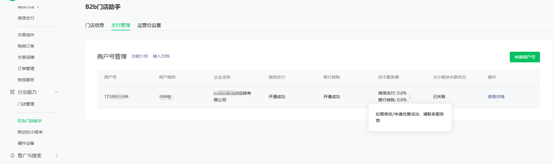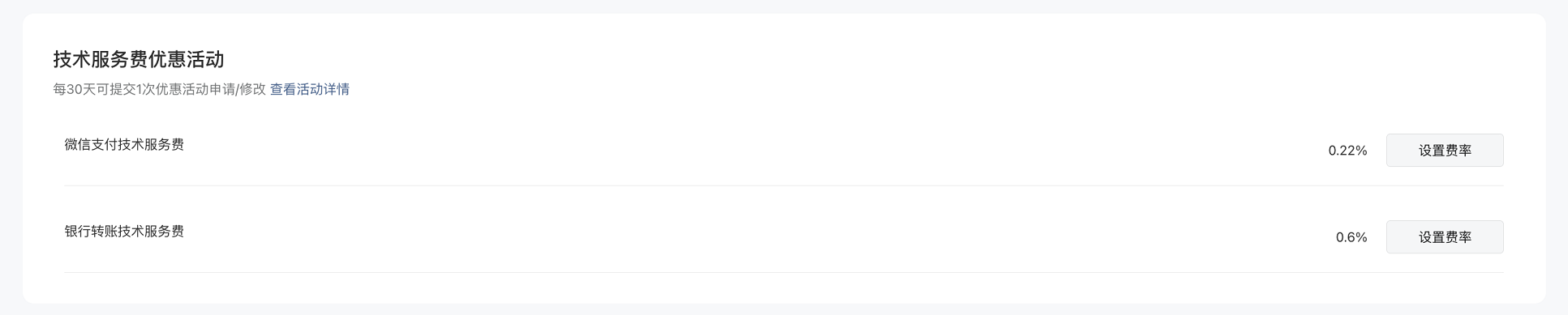 商户号开通成功后,可分别报名微信支付、银行转账的技术服务费优惠活动。