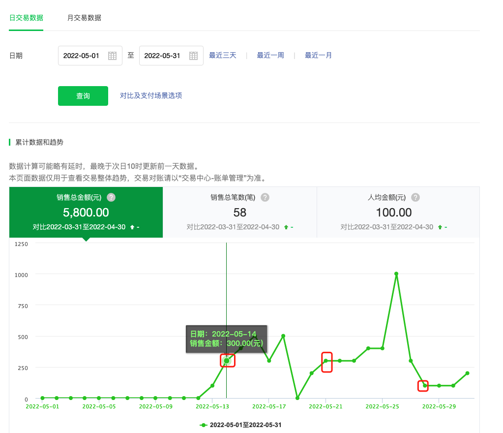 下图中标红的三天,分别为5.14(展示金额300)、5.21(展示金额300)、5.28(展示金额100)