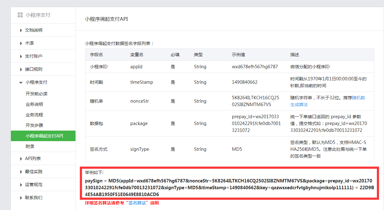 第一次做支付,后端告知 paySign 由小程序端自己生成;说按照文档来,文档如下: