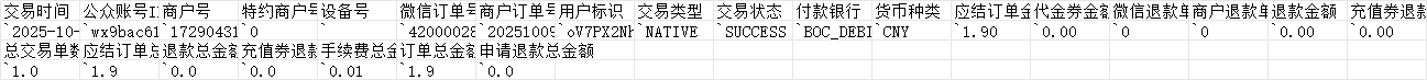 `2025-10-09 10:49:13 `wx9bac61da00071aae `1729043151 `0 ` `4200002811202510091407666590 `20251009104850531976 `oV7PX2NhaEo8wX7Pqtfk9Qaemttw `NATIVE `SUCCESS `BOC_DEBIT `CNY `1.90 `0.00 `0 `0 `0.00 `0.00