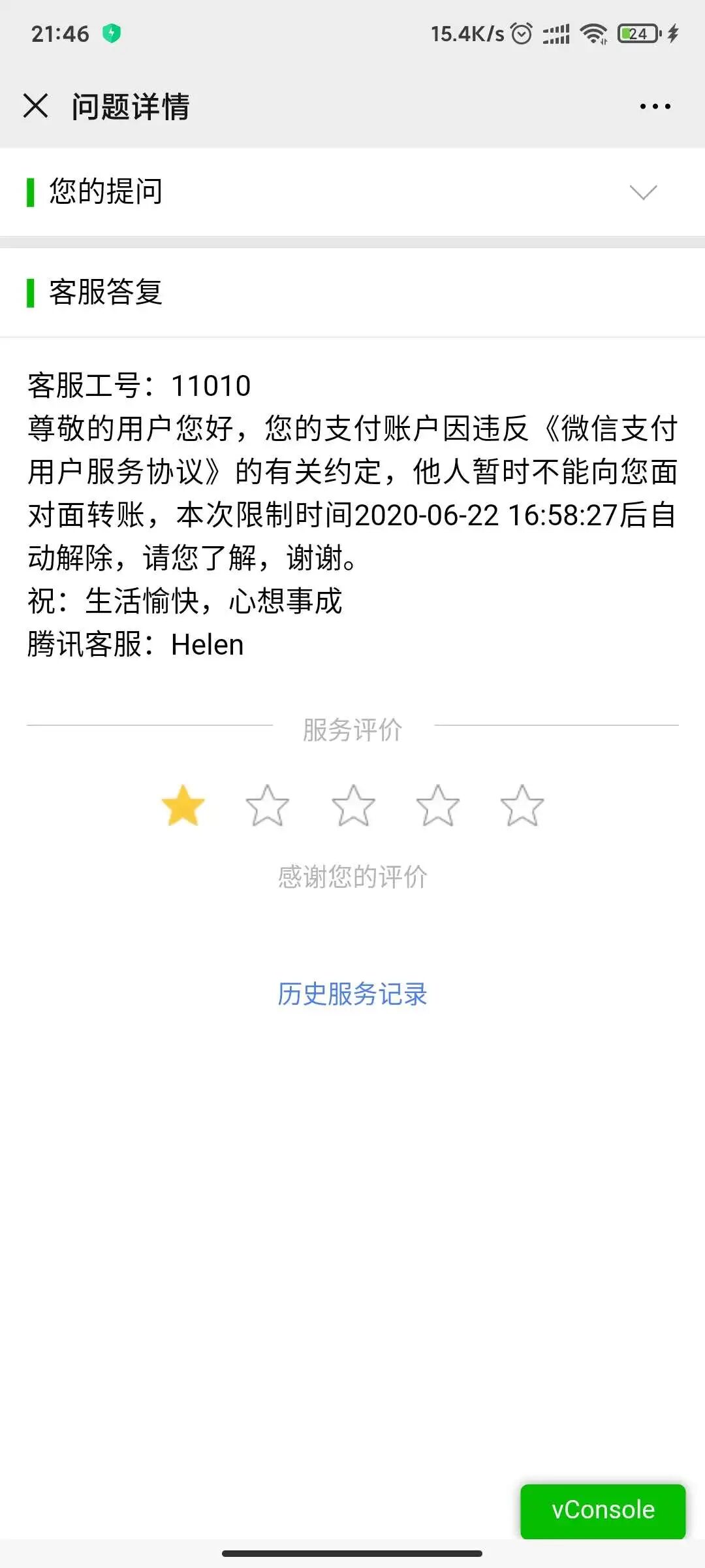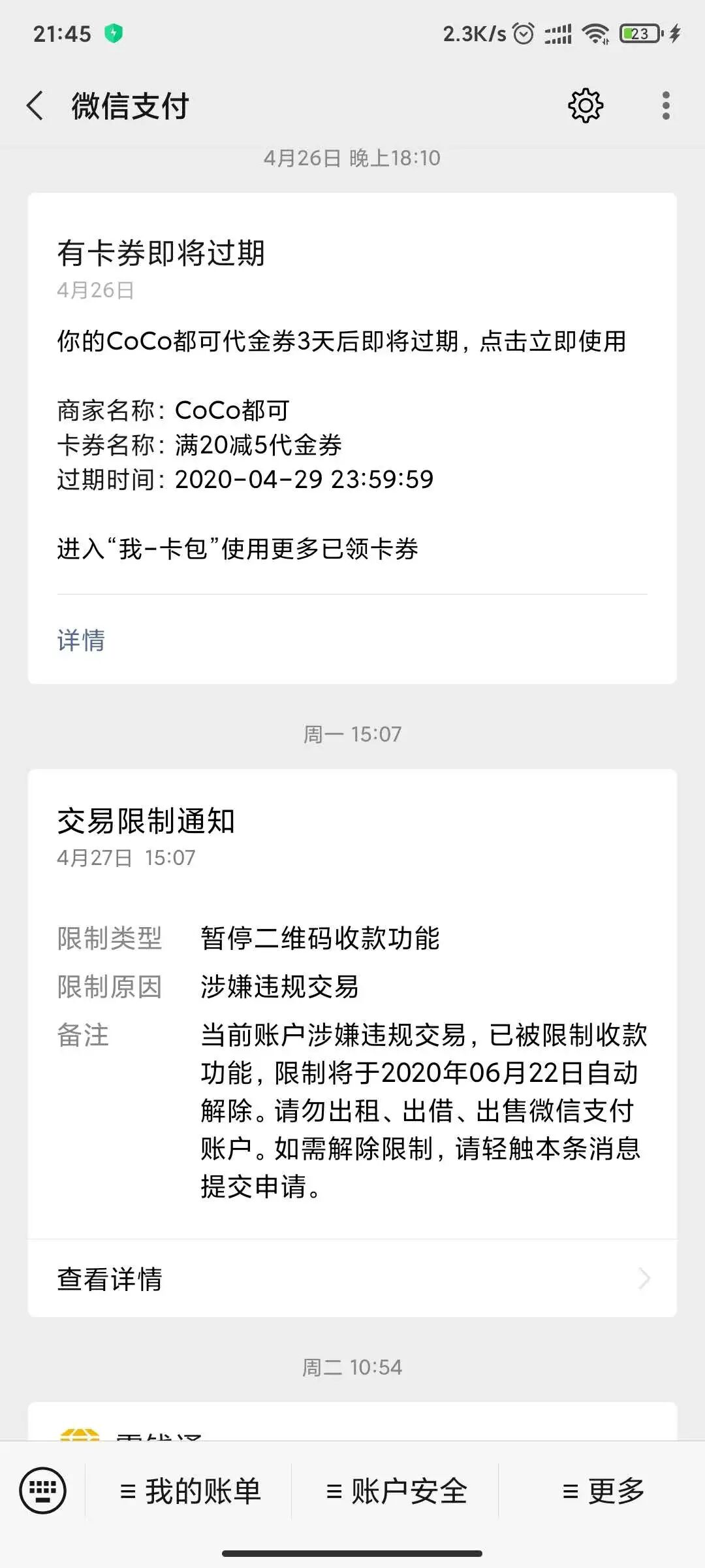 4月27日接到微信支付收款码通知,说是涉嫌“出租、出借、出售微信支付账户”,把我的收钱二维码暂停使用了,通过多方申诉依然无处理结果,真是莫名其妙的搞笑了,首先,我觉得误封可以理解,但是我提出申诉,你们看都不看看的?已经上传我半年的账单记录,请你们好好审核查一查,我的微信支付账户,是没有任何问题的!我有一个实体店铺,个人收钱二维码和商户二维码混用的,难不成因为个人收钱码没有手续费可以抽成,就把我个人收钱码封了?微信账户:ahao9996