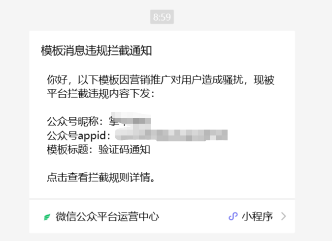 除了这个模板消息,还有类似消费通知、充值通知等正常的客户通知也在今早上被屏蔽了,影响我们上千个客户。