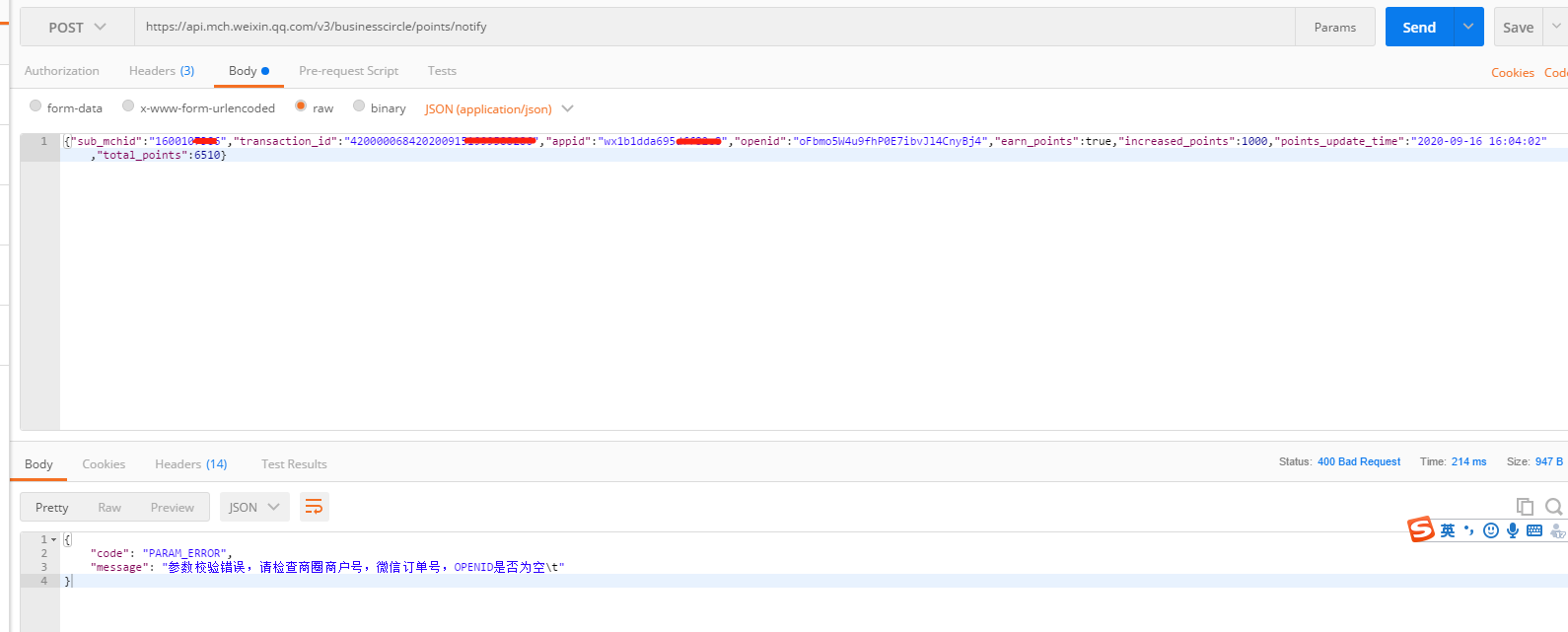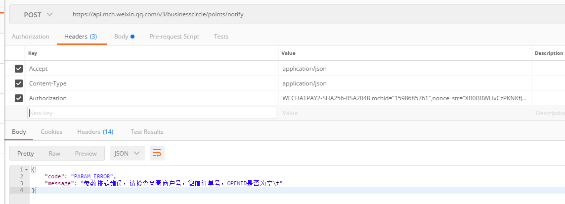 header值:Accept:application/jsonContent-Type:application/jsonAuthorization:WECHATPAY2-SHA256-RSA2048 mchid="1598685761",nonce_str="XB0BBWLixCzPKNKfJAxuufQKm96qSt3H",timestamp="1600243443",serial_no="53C0924AF0EF70DDABF5CE83A950CEF3D4B4A4AF",signature="z0mVt74SHl6+j5xo6tHij6abTGFaDmbAjw9+nGctDRXY/73LaV9UTx0hKFbN2fgIfjsySspfuhu0+dd7Rz10cgIMpFH+GtkWBnD3idYPLqDjpkwesFTlYTOw7Zmo9n3LCiELOllPUERqI8YGH4N8pK0ke8fEwVQVMgzqYiCNaBYJIUGHrxQFqu7HsWDoeyE38D5woyLzFRkQ6fsTopRB1cKl9rWvNjb5dtHaivyVjSyYq11fG/K3N8CQqFIU1PyiYOt/R+YVxh4HrS/eeWBMoN5ATGhvVLdlNu1CkG9ml1rvGpkdI4tfrDu21dwEIdhwIPaborlZ4LCaI+m96taf4A=="body值:{"sub_mchid": "1600107386","transaction_id": "4200000684202009151999588286","appid": "wx1b1dda695dff82c8","openid": "oFbmo5W4u9fhP0E7ibvJl4CnyBj4","earn_points": true,"increased_points": 1000,"points_update_time": "2020-09-16 16:04:02","total_points": 6510}