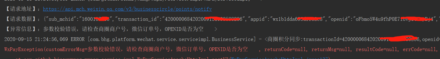 智慧商圈,同步积分的时候,如图所示:商圈商户号,微信订单号,OPENID都不为空,为什么还会有这种提示?