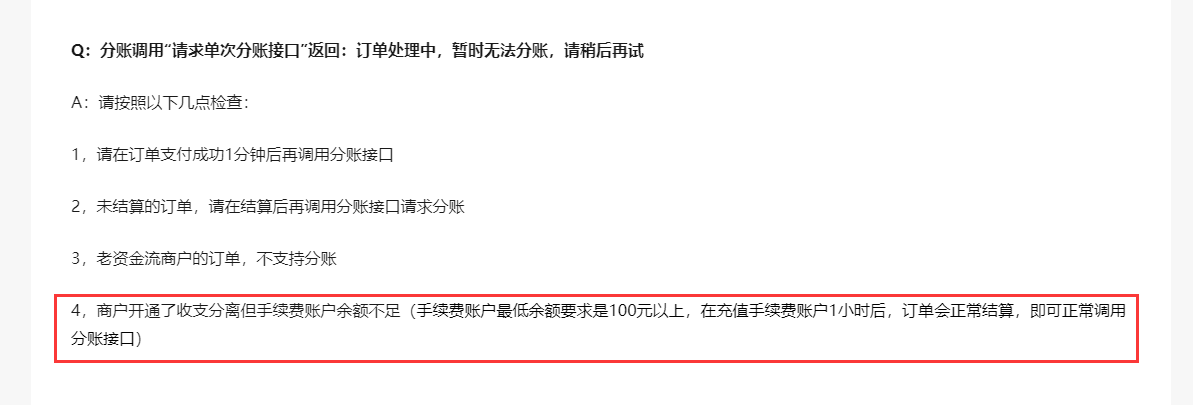 {"code":"INVALID_REQUEST","message":"订单处理中,请确保手续费账户余额充足再请求分账"}