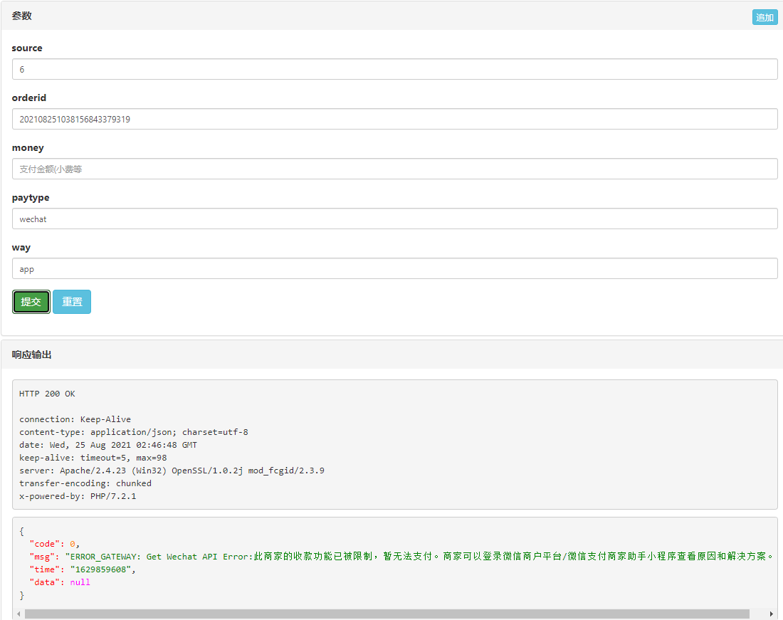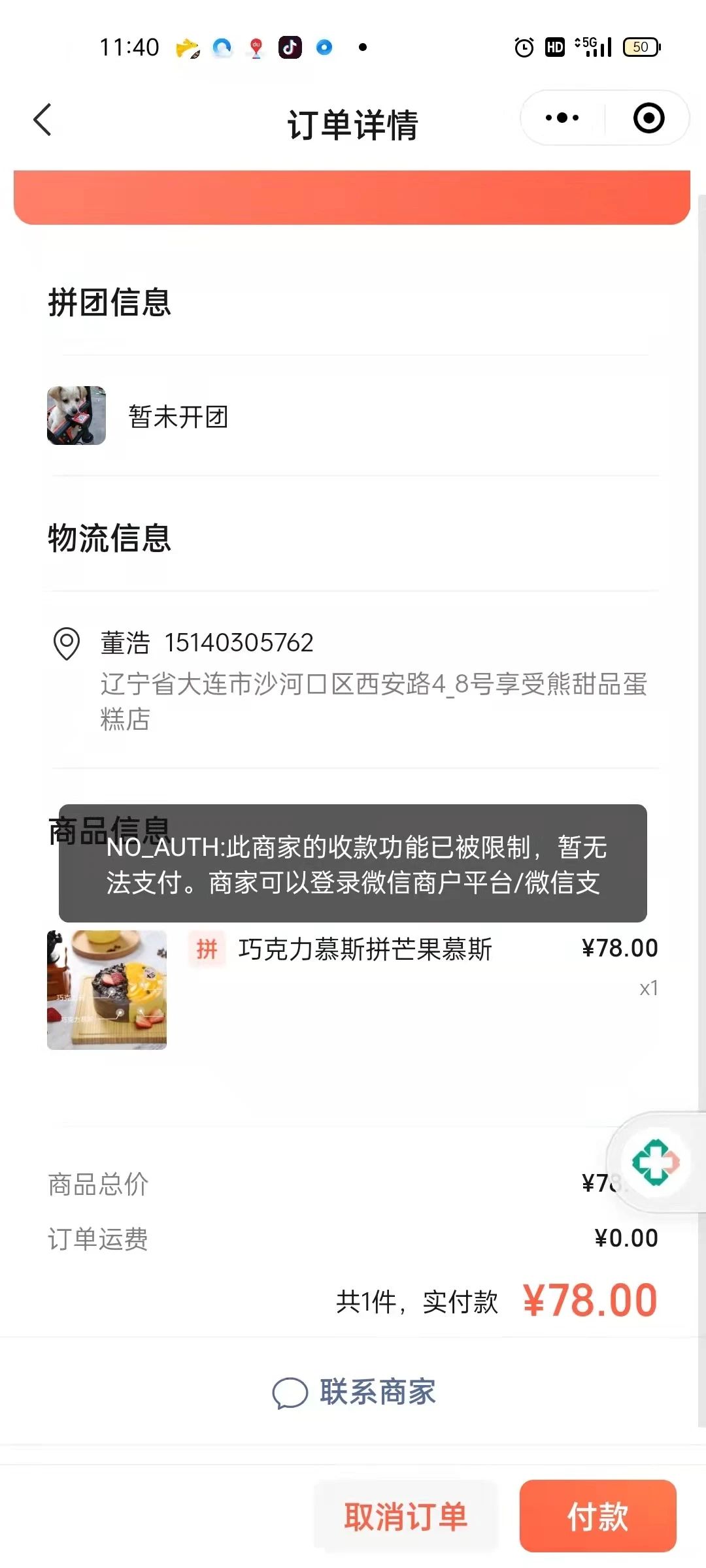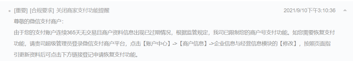 2025-01-06 15:32:43==>INFO :此商家的收款功能已被限制,暂无法支付。商家可登录微信商户平台/微信支付商家助手小程序/经营账户页面查看原因和解决方案。