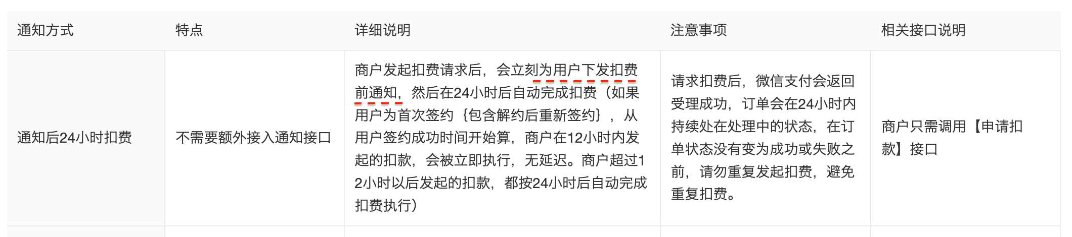 “通知后24小时扣费”模式:不需要额外接入通知接口,商户发起扣费请求后,会立刻为用户下发扣费前通知。