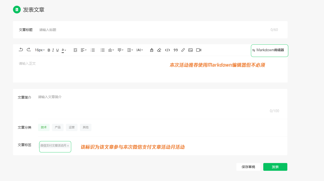 文章标签添加「微信支付文章活动月」,该标识为该文章参与本次微信支付有奖文章活动月活动,大家不要漏了这点哦~