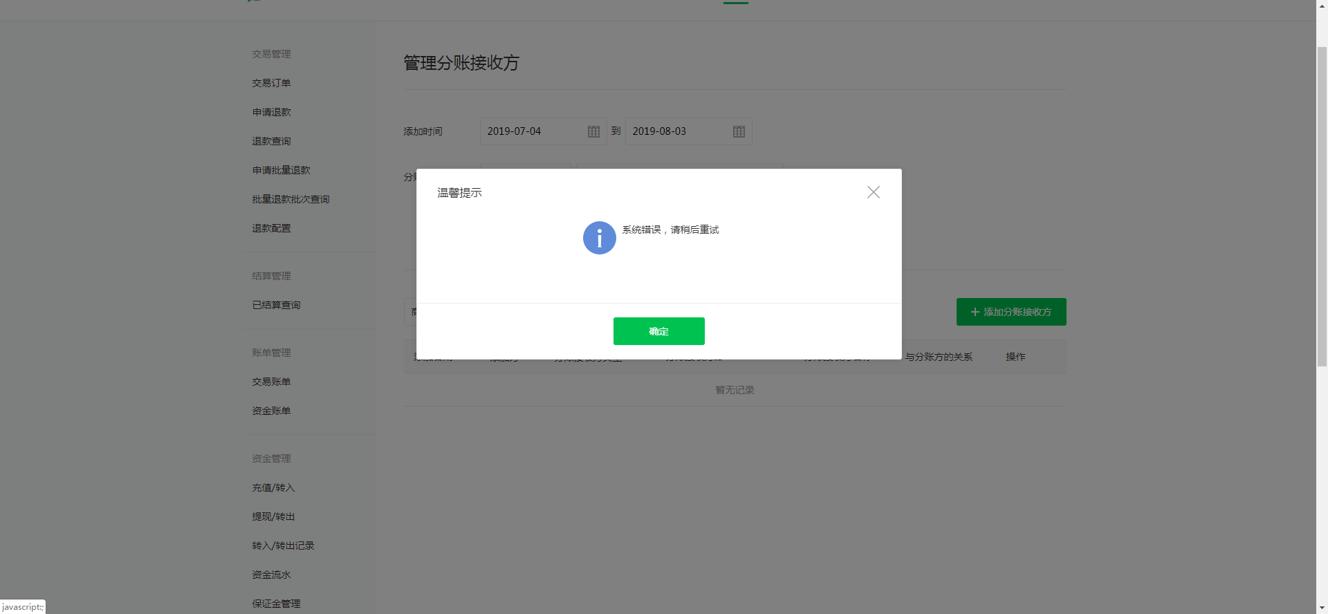 在特约商户号中添加服务商作为分账接收方,提示“系统错误,请稍后重试”,请问具体添加失败的原因是什么呢?