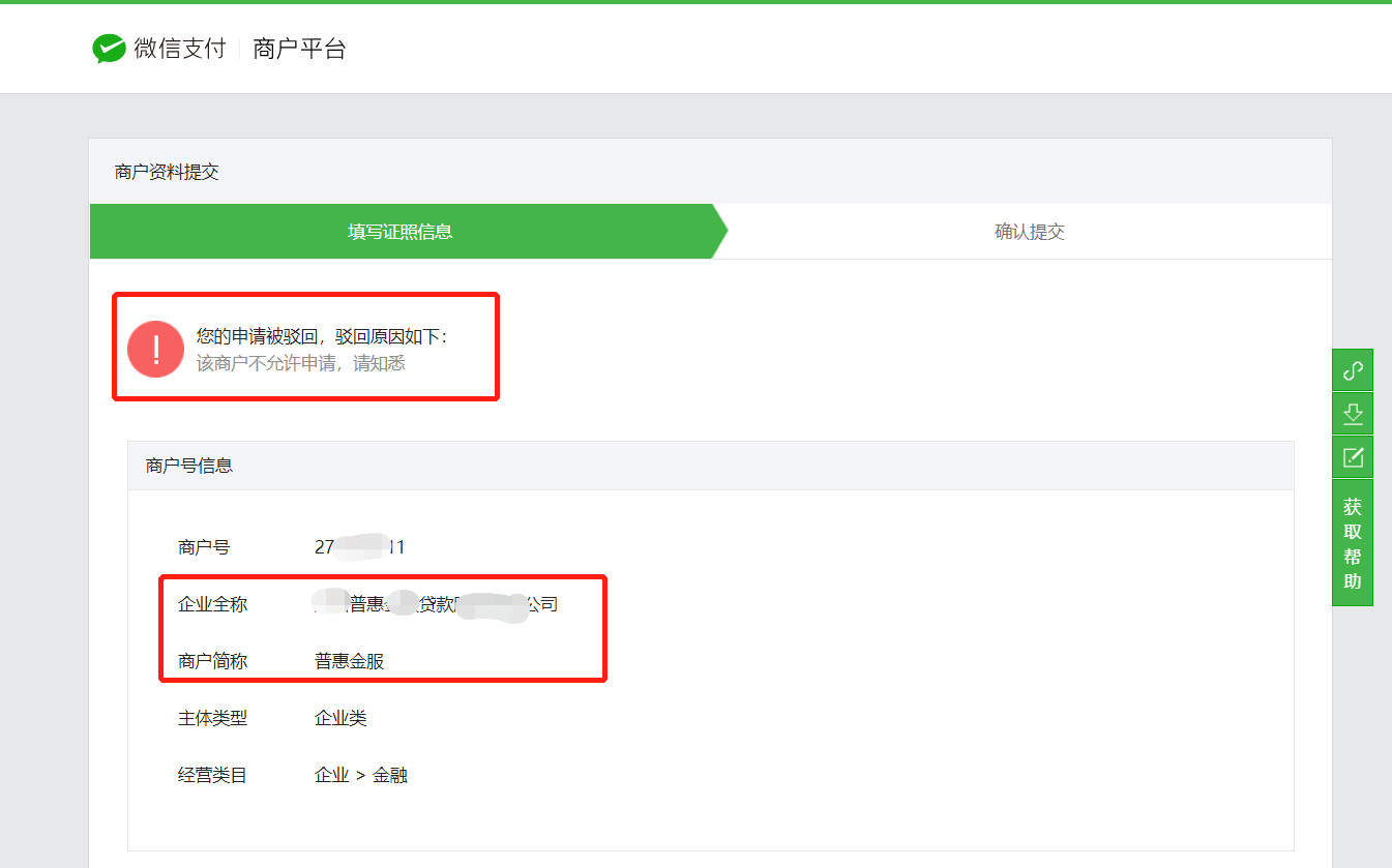 我们平台有个商户报备到微信支付特约商户平台以后点击“认证”,录入资料的时候。被驳回了。提示:“该商户不允许申请,请知悉”。请问是金融行业网贷类型公司都不允许申请线上微信支付吗?有没有具体的规则明细可以参考的。希望官方看到后翻下我牌子,感谢~~~