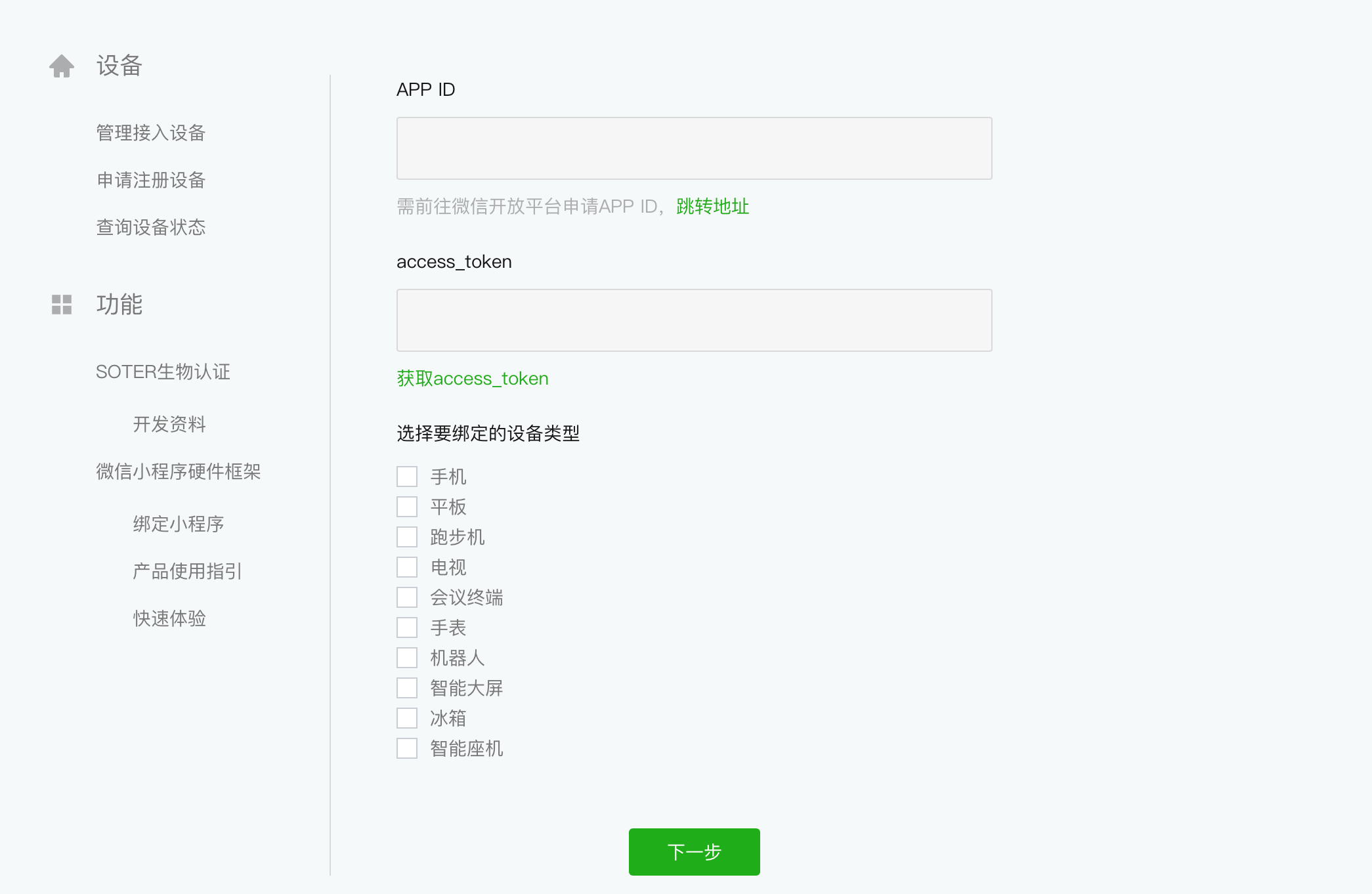 为了给设备开通小程序运行权限,需要填写微信开放平台的移动应用 AppID,并输入 access_token,完成设备运行小程序的权限校验。