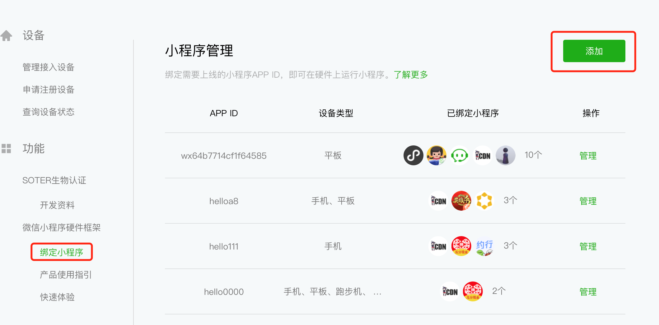 如果有更多绑定需求,可创建多个移动应用。但需要注意的是,同一台设备只能绑定一个移动应用 ID。小程序开发者可在微信公众平台后台关闭对设备的授权,授权关闭后,小程序将不能再在该机型上使用。
