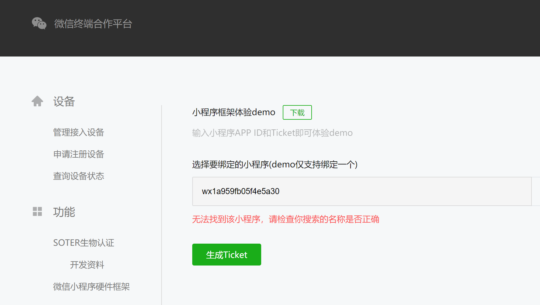 # 1. 微信终端合作平台 快速体验 demo 无法搜到小程序