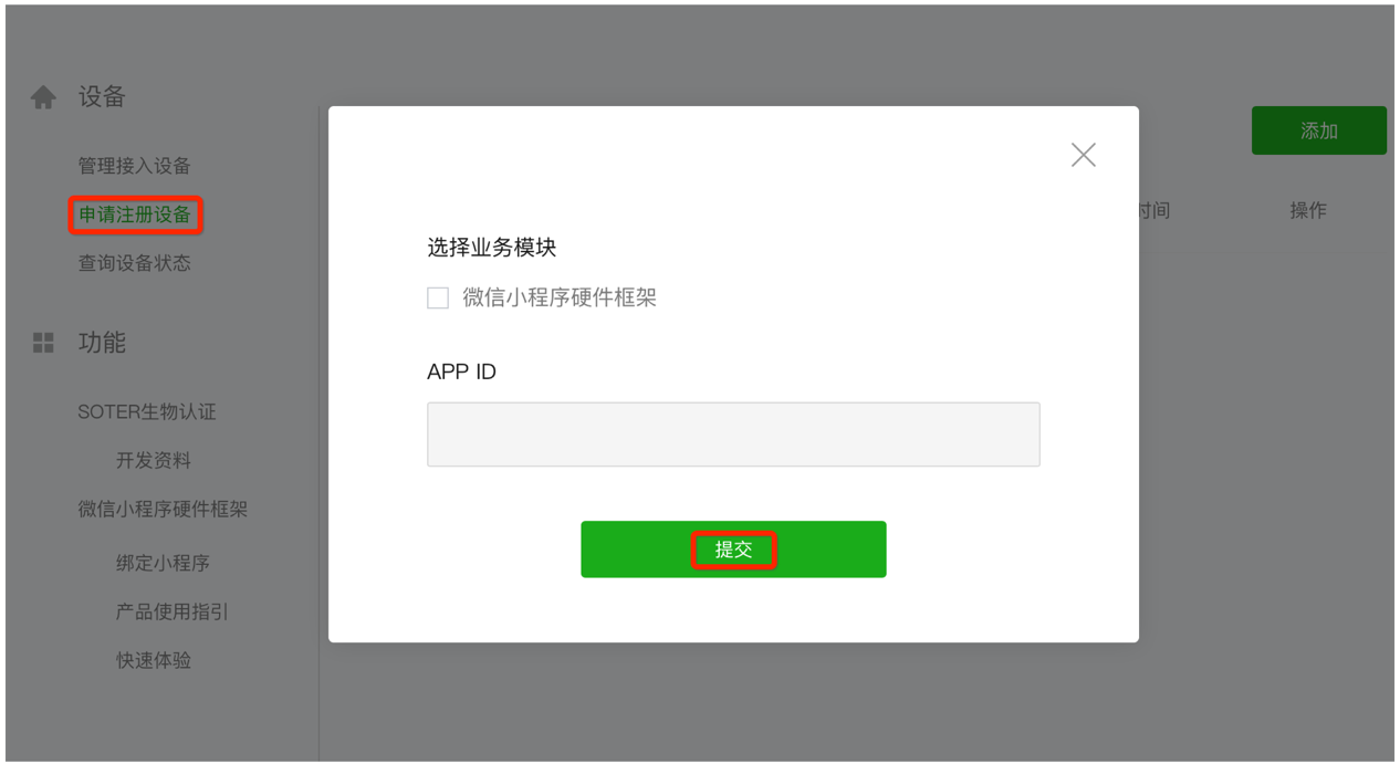 若未显示,则点击「添加」,然后勾选「微信小程序硬件框架」,并在「APP ID」下方填入移动应用 ID 。
