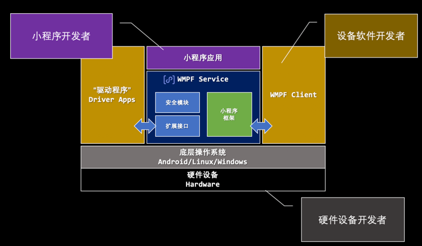 完整的 WMPF 应用包括微信小程序、WMPF Service 、WMPF Client 、设备操作系统以及相关的驱动程序,分别由小程序开发者、硬件设备开发者和设备软件开发者进行开发: