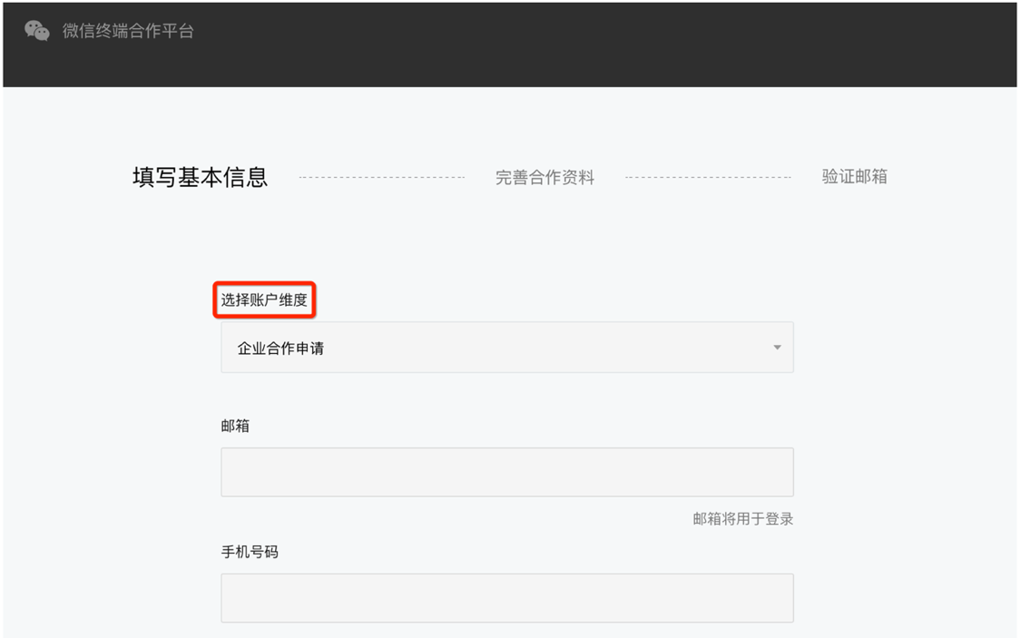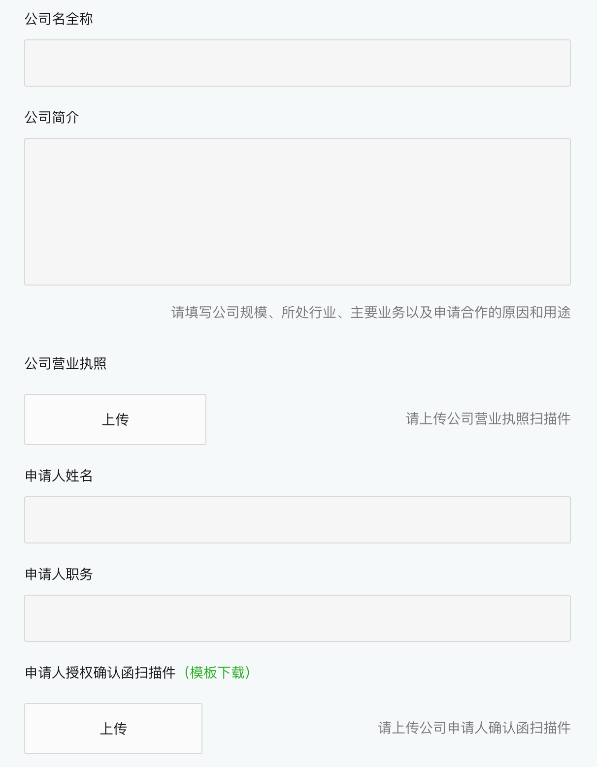 若你已确定采用 WMPF 开发商用设备并计划公开发布,请选择「企业合作申请」;请提前准备企业简介、执照、授权函等材料用于企业账号注册审核。