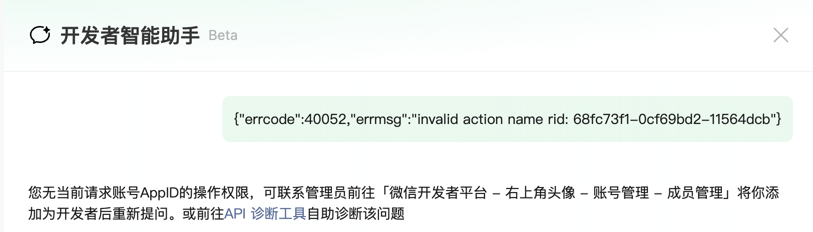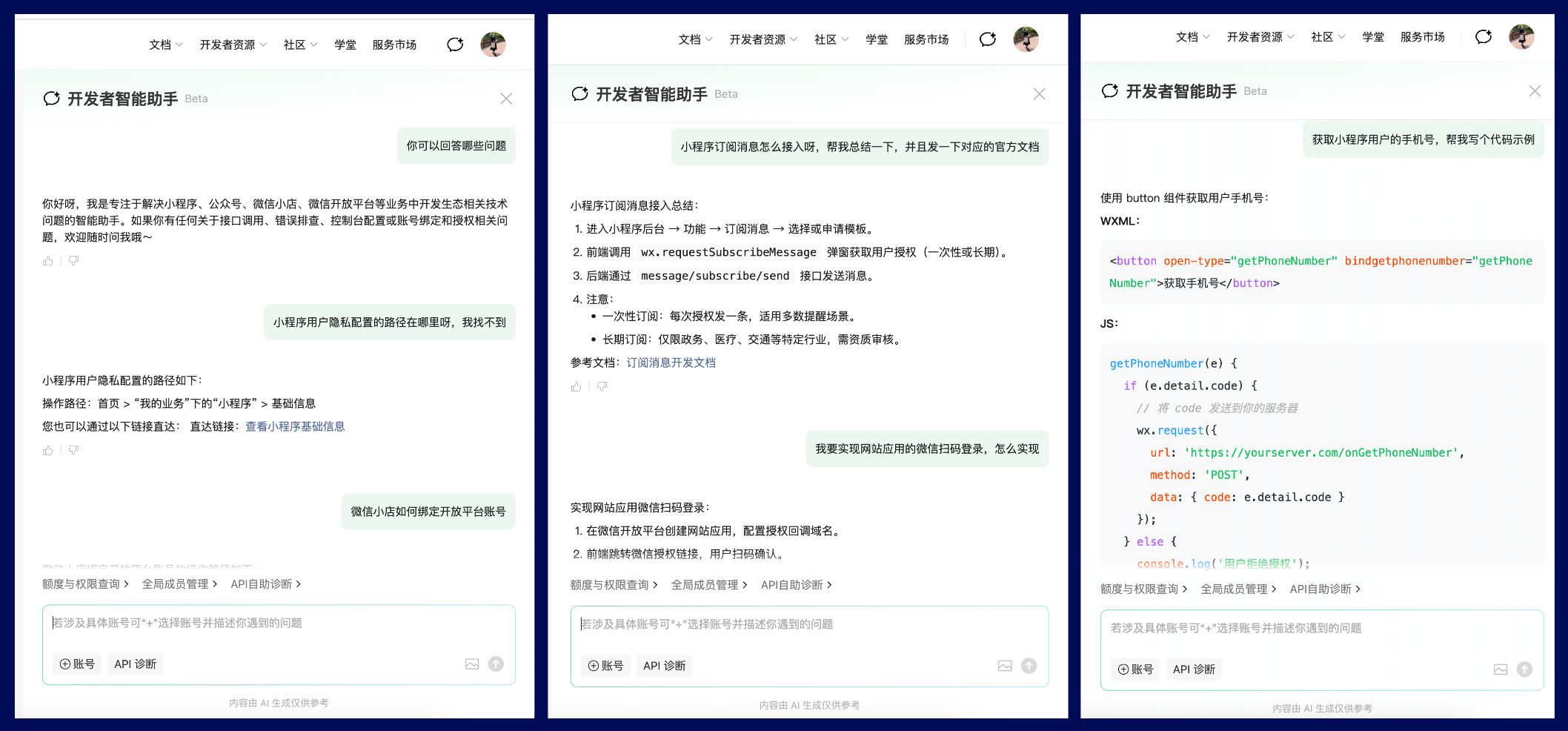 为帮助开发者更高效、及时地解决开发过程中遇到的微信开发生态技术问题,平台现已推出「开发者 AI 助手」。无论是 API 调用异常、功能使用不符合预期,还是对产品能力、账号绑定及授权规则存在疑问,AI 助手都能为您提供实时、精准的解答。