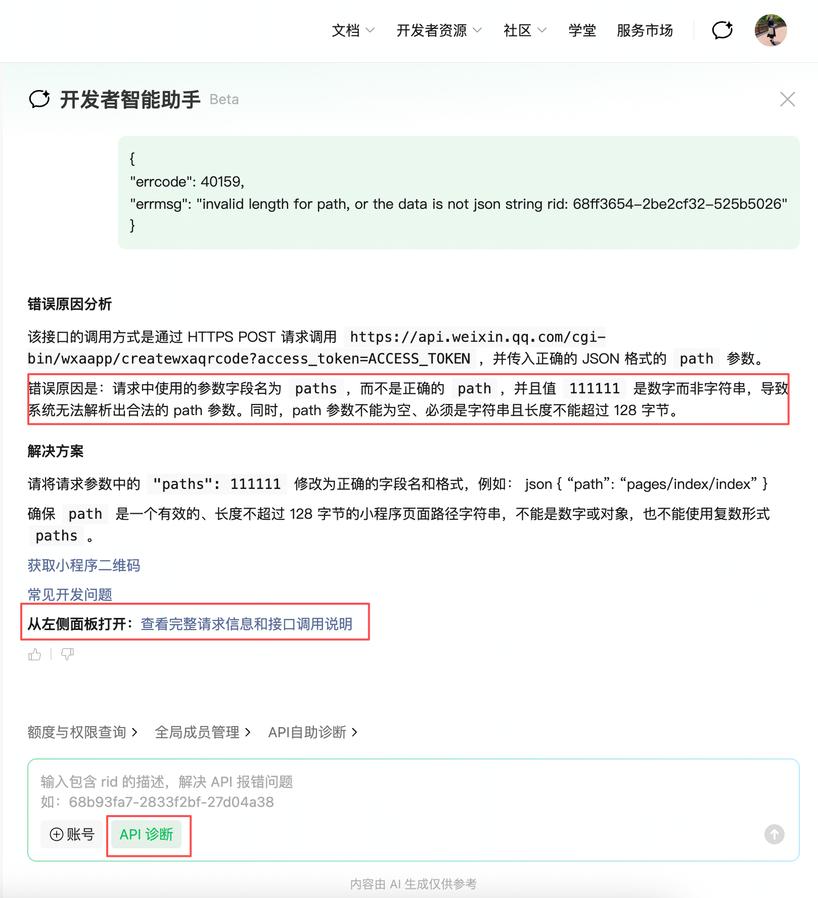 开发者可在 AI 助手中发起智能的 API 诊断,在 AI 对话框中激活「API 诊断」模式即可,如下截图,输入包含有效 rid 的内容即可。