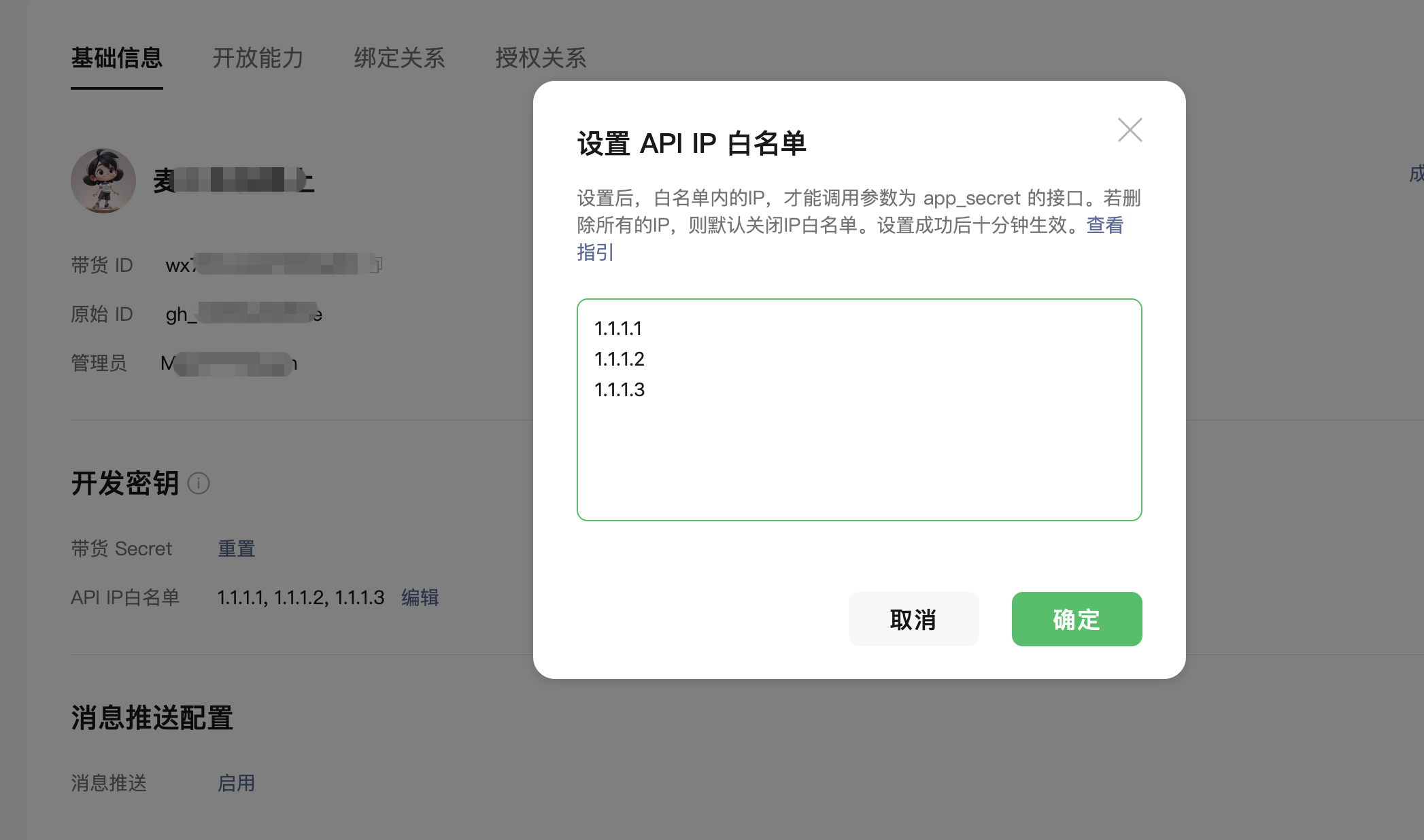 - 添加「IP白名单」 路径为:微信开发者平台 - 我的业务,然后点击带货助手进入详情页,然后前往「基础信息 - 开发信息」即可配置 API IP 白名单
