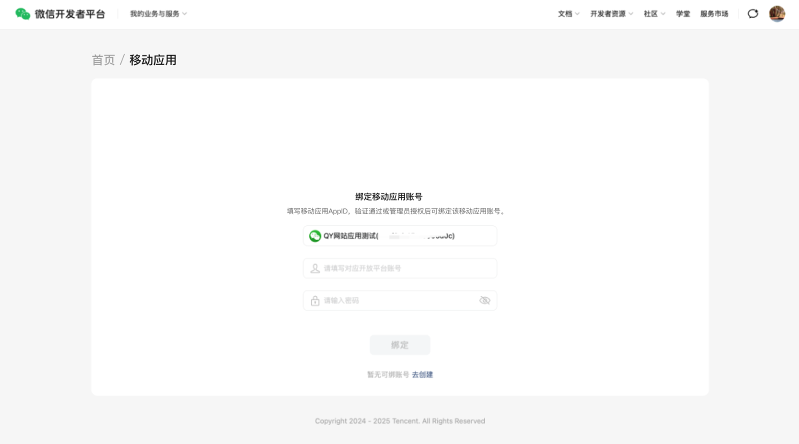 可前往 「微信开发者平台 - 我的业务 - 移动应用 - 绑定账号」绑定为管理员, 具体流程如下: