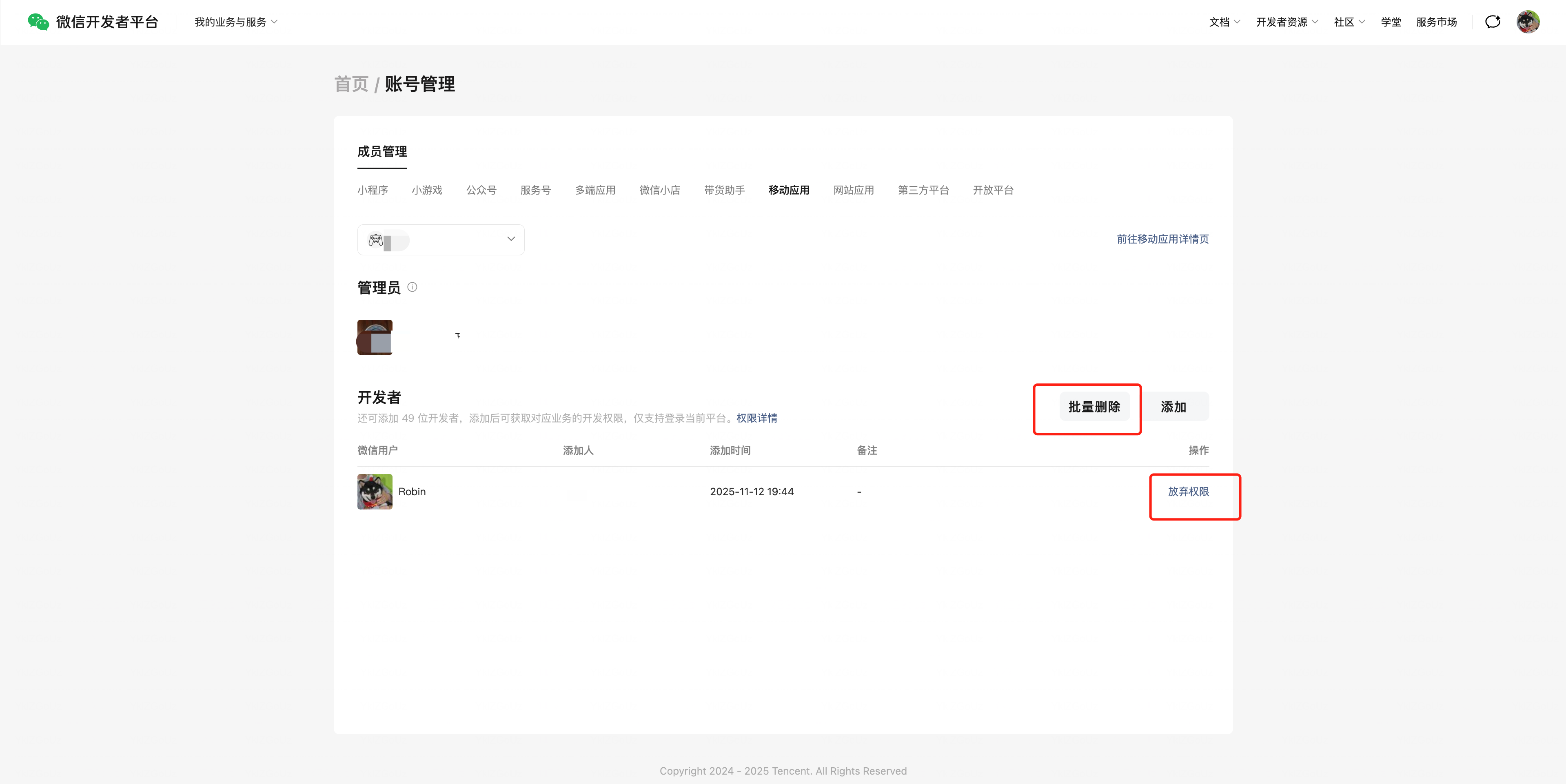 - 如自己不想再担任该账号的开发者,点击「放弃权限」即可,无需管理员扫码授权(注:非管理员才可以放弃权限)