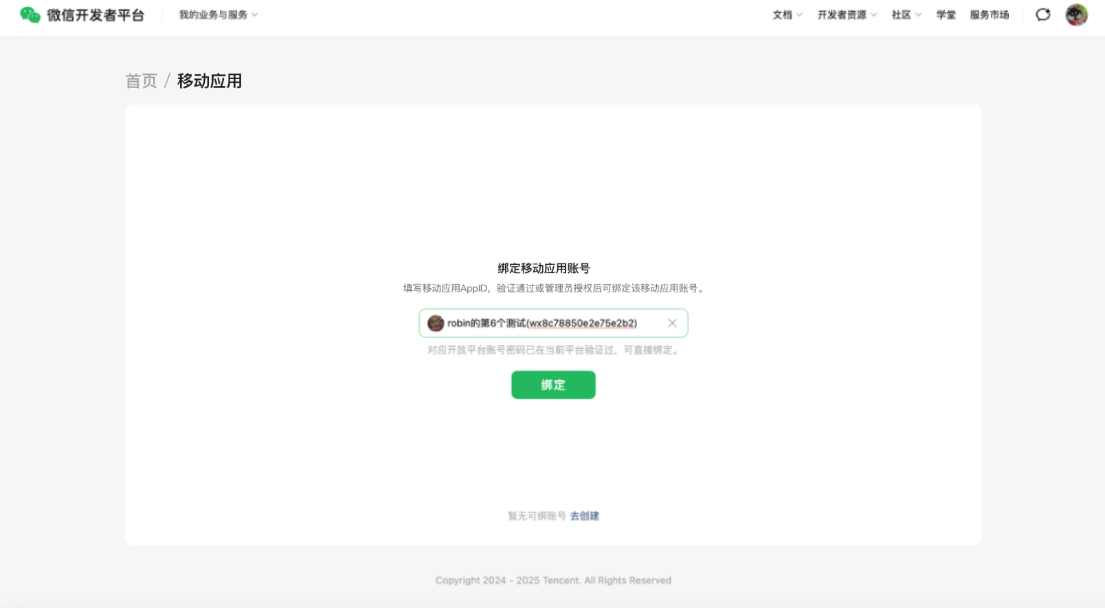 步骤三: 验证通过后,你将作为管理员直接绑定,并进入移动应用详情页。