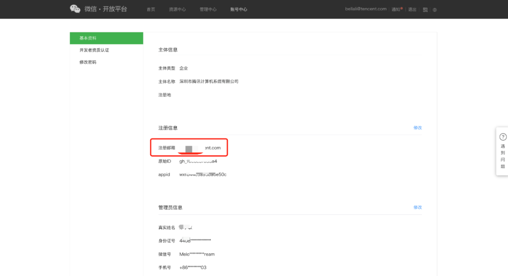 注:1、所属的开放平台的邮箱,可前往「微信开放平台-账号中心-基本资料-注册信息」处查看
