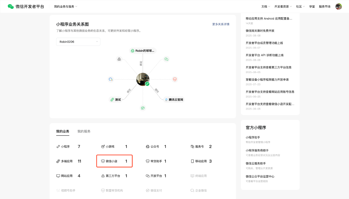 微信开发者平台可以开发管理【微信小店】业务,你可以在首页查看自己的微信小店账号数。