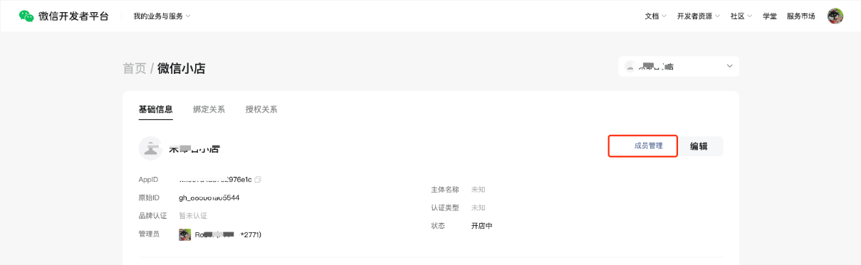 (1)从【微信小店】的账号业务详情页的,「成员管理」入口进入