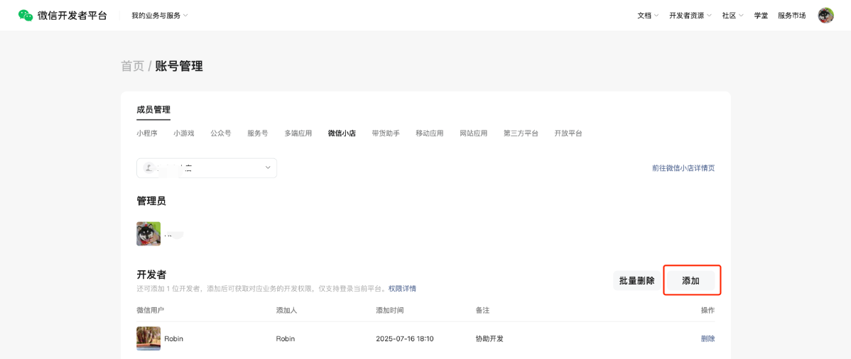 注:一个【微信小店】账号最多可添加 5 个开发者。