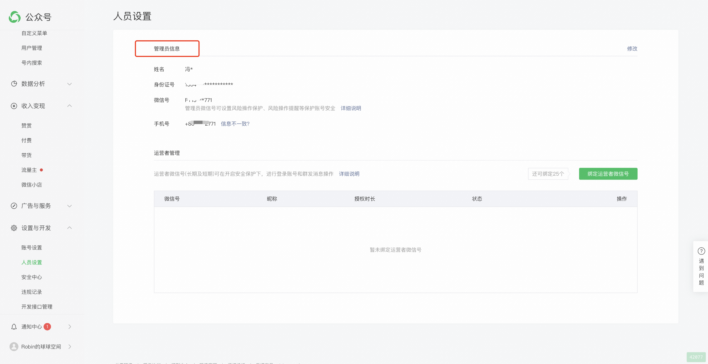 - 公众号或服务号的管理员信息,可前往「微信公众平台-设置与开发-人员设置-管理员信息」中查看