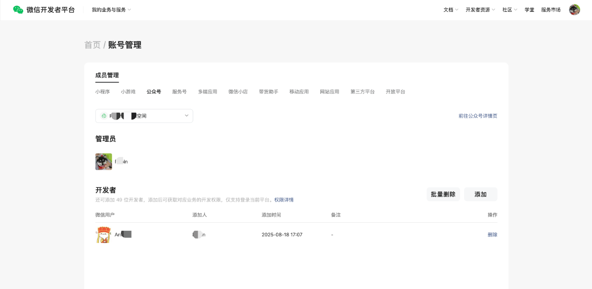 注:一个公众号/服务号账号最多可添加 50 个开发者。
