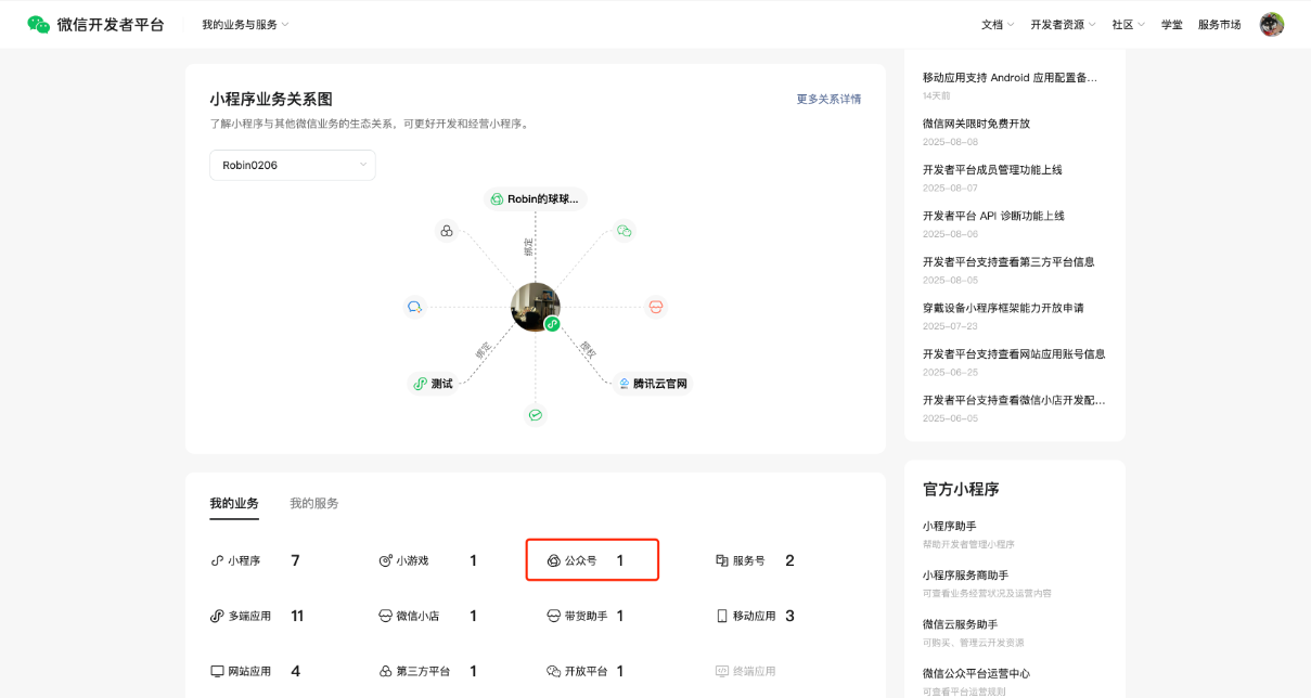 微信开发者平台可以开发管理【公众号/服务号】业务,你可以在首页查看自己的公众号/服务号账号数。