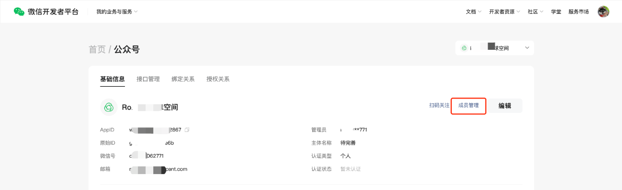 (1)从【公众号/服务号】的账号业务详情页的,「成员管理」入口进入