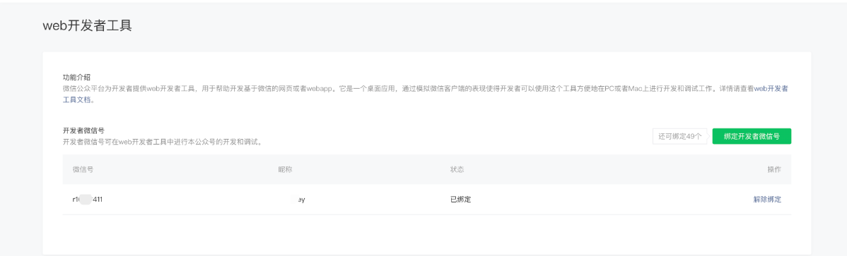 - 管理员可在「微信公众平台 - 设置与开发 - 开发接口管理 - 开发者工具 - web开发者工具」绑定开发者微信号。
