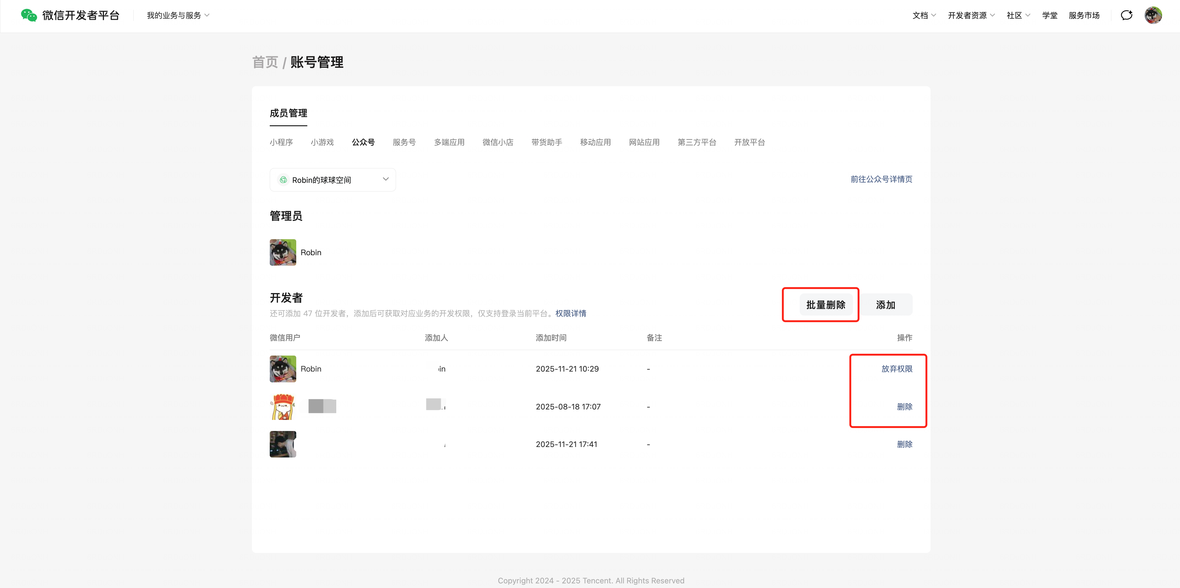 - 如项目变更或团队协作变化,「成员管理」支持删除成员与放弃权限,删除成员或放弃权限后,该成员将失去在微信开发者平台关于该账号的权限,如不能查看该账号的业务详情等其他便捷开发功能。