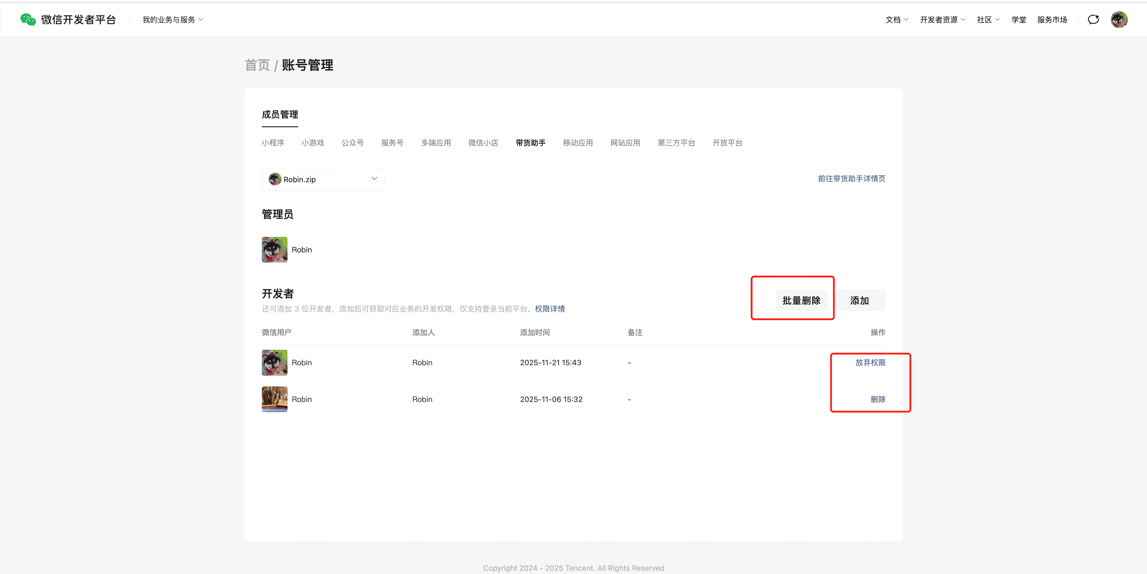 - 如项目变更或团队协作变化,「成员管理」支持删除成员与放弃权限,删除成员或放弃权限后,该成员将失去在微信开发者平台关于该账号的权限,如不能查看该账号的业务详情等其他便捷开发功能。