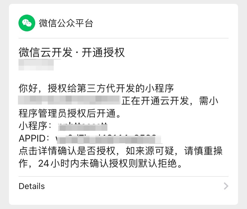 小程序管理员授权确认之后,重新调用本接口进行开通。