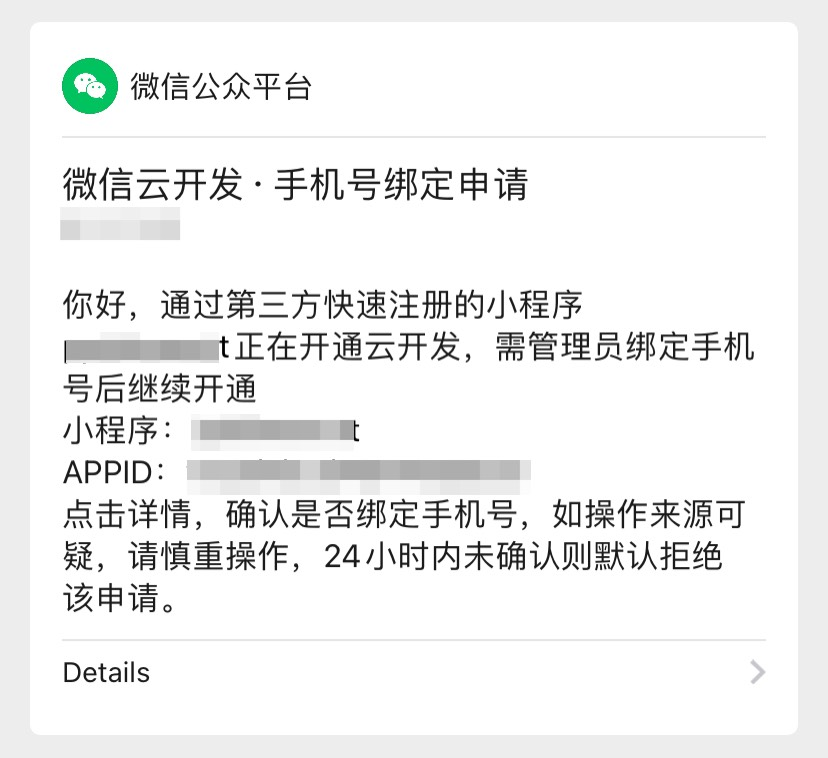 | -601048 | appid 没有手机号,已发送模板消息至 appid 管理员,联系管理员绑定手机号授权确认 | appid 没有手机号,已发送模板消息至 appid 管理员,联系管理员绑定手机号授权确认 |