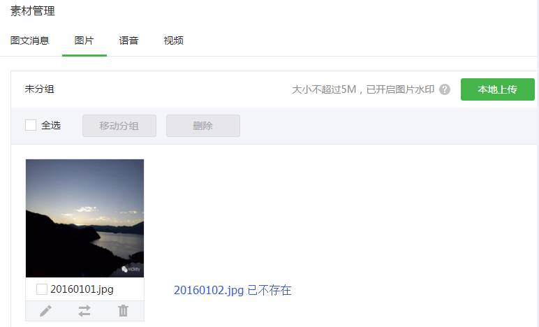 首先需要知道该图片的mediaID,方法上小节已讲述。代码可参考上小节:Material().delete() 接口 调用接口成功后,在公众平台官网素材管理的图片中,查询不到已删除的图片。
