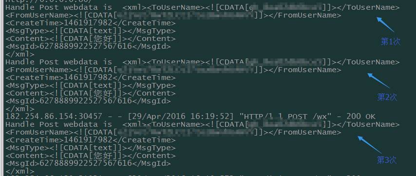粉丝给服务号发送文本消息:“欢迎开启服务号开发者模式”,在开发者后台,收到公众平台发送的xml 如下:(下文均隐藏了ToUserName 及 FromUserName 信息)